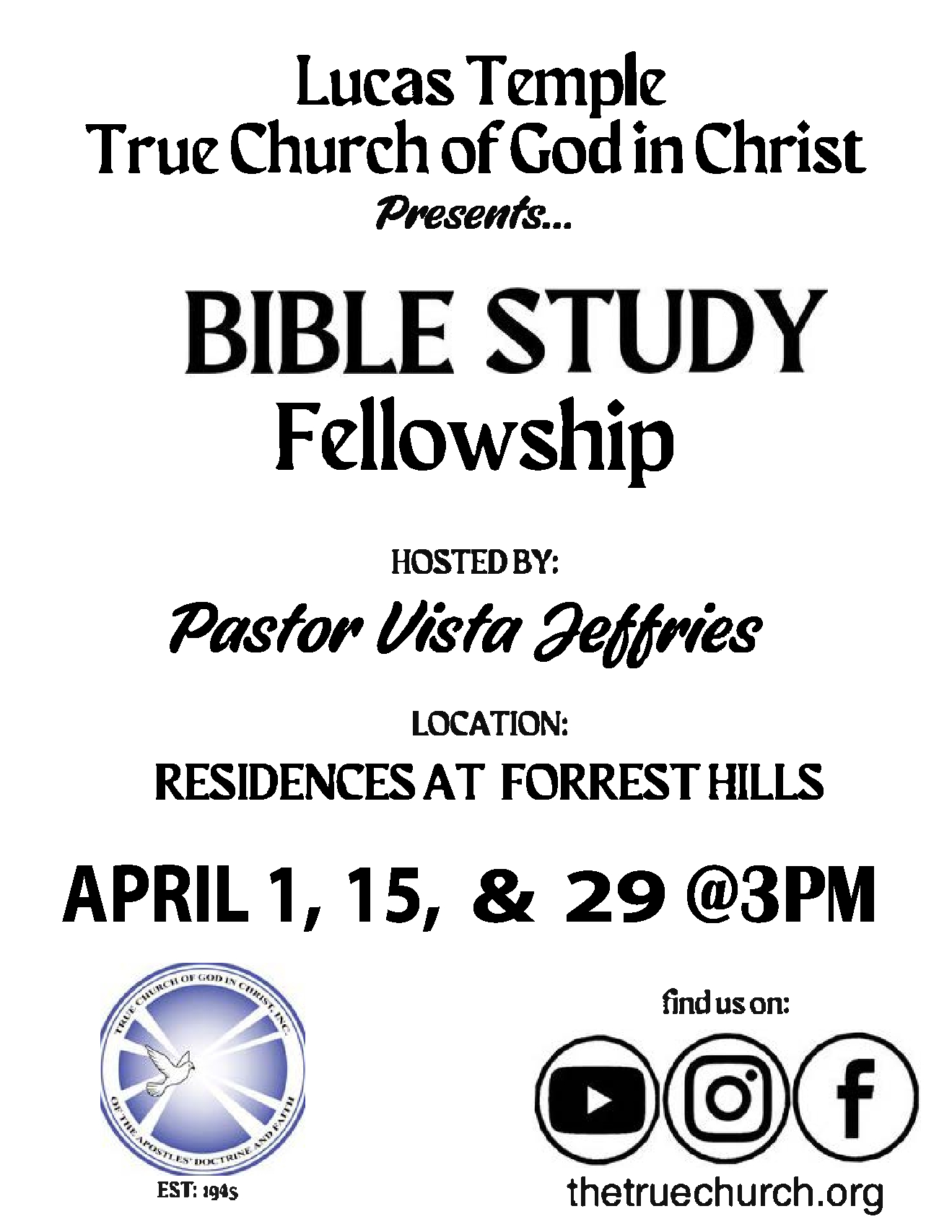 6:00 pm - 7:00 pm Lucas Temple Outreach at the Manor at Indian Creek April 1 @ 6:00 pm - 7:00 pm Lucas Temple Outreach at the Manor at Indian Creek