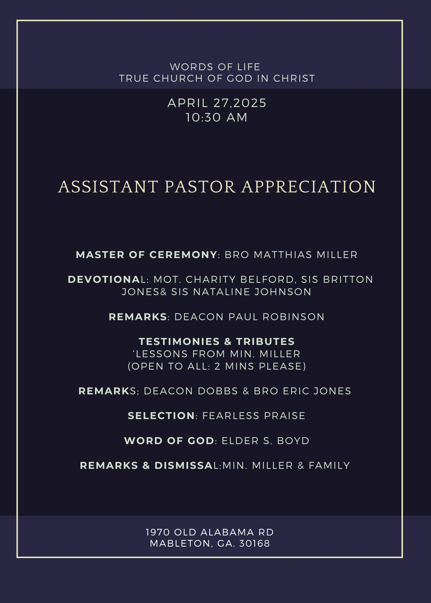 Saturday, April 26, 2025 @ 6PM Augusta & Burke County Choir in Charge Devotional …………… Bryant Temple & Christ Anointed Mistress of Ceremony/Welcome………... Sister Naomi Jones Remarks……………………………………… Elder Torie Cody Solo/Song………………………….…… Sister